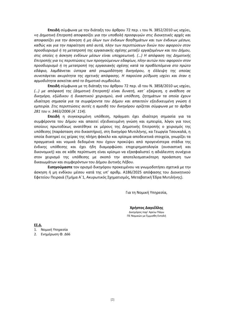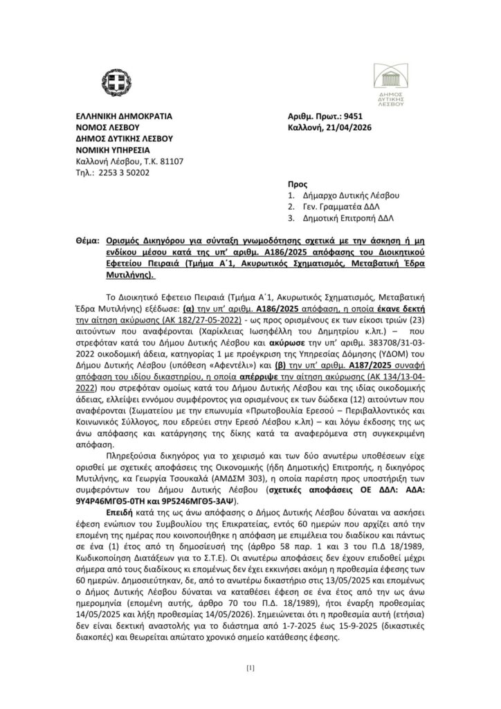 Σαν δεν έφταναν όλα αυτά χτες πληροφορηθήκαμε πως ΑΚΟΥΣΤΕ, η νομική υπηρεσία του Δήμου απέστειλε εισήγηση στις 23 Απρίλη προς την Δημοτική Επιτροπή και τον Δήμαρχο, την οποία και δημοσιεύουμε σήμερα, με την οποία ζητάει να ανατεθεί σε δικηγόρο να γνωμοδοτήσει αν πρέπει να κάνει ο Δήμος Δυτικής Λέσβου Έφεση στην απόφαση του Διοικητικού Εφετείου Πειραιά! Μιλάμε για απίστευτα πράγματα!