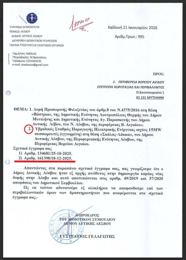 Η δήλωση του Δημάρχου πως δεν γνώριζε η Δημοτική Αρχή εγκαίρως για το Υβριδικό Πάρκο είναι αναληθής. Και δεν το στηρίζουμε αυτό ούτε στο έγγραφο της ΥΔΟΜ ούτε στην οικογενειακή σχέση Δημάρχου και Προϊστάμενης της ΥΔΟΜ. Στο Δημοτικό Συμβούλιο η ίδια η αρμόδια αντιδήμαρχος ανέφερε ότι το έγγραφο ενημέρωσης έφτασε στις 20-21 Δεκέμβρη. Αρχικά η δήλωση αυτή από μόνη της αναιρεί την θέση του Δημάρχου ότι δεν γνώριζε εγκαίρως. Επιπλέον γνωρίζουμε πως το έγγραφο της Περιφέρειας δεν πήγε ούτε 20-21 Δεκέμβρη γιατί ήταν Σαββατοκύριακο εκείνες τις μέρες. Η ακριβής ημερομηνία που ο Δήμος Δυτικής Λέσβου ενημερώθηκε για την διαβούλευση του Υβριδικού Πάρκου και την ανάγκη γνωμοδότησης ήταν η Πέμπτη 18 Δεκέμβρη με το υπ. Αριθμόν 161398 έγγραφο. Και το γνωρίζουμε αυτό από την απάντηση του Προέδρου του Δημοτικού Συμβουλίου προς την Περιφέρεια, ένα έγγραφο που δημοσιοποιούμε σήμερα για πρώτη φορά επίσης. Άρα η Δημοτική Αρχή μια χαρά γνώριζε και για την διαβούλευση του Υβριδικού Πάρκου έναν ολόκληρο μήνα πριν αυτή να λήξει!